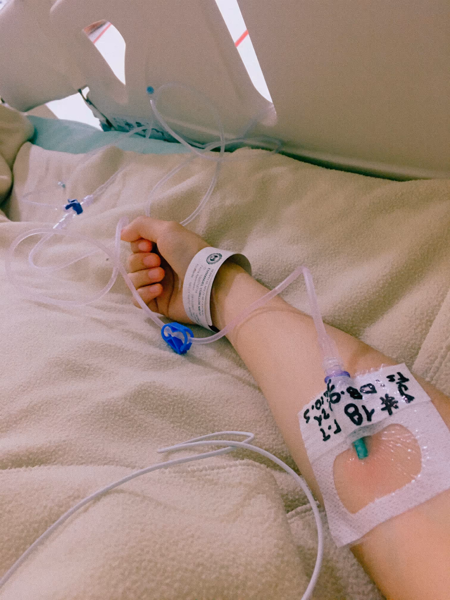 Un jarrón con dos bolsas de solución salina, una unidad de sangre.