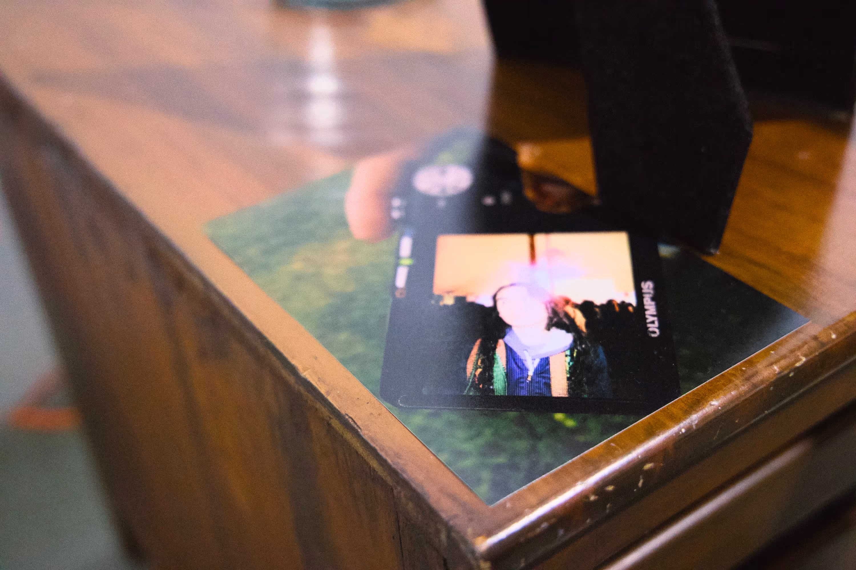 Un portarretratos vacío; atrás, una foto de una foto que me tomaron un día de junio.
